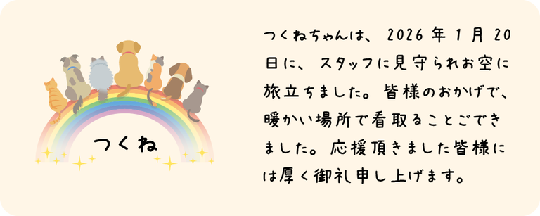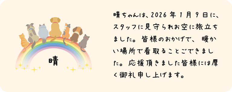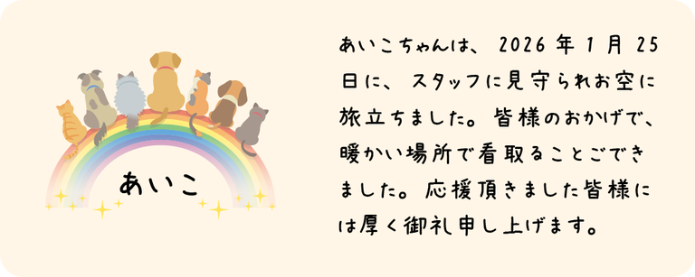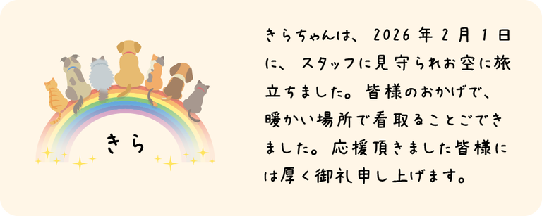 20年以上前になりますが、こちら(グリーンハート)にいた女の子を引き取り、家族になりました。今はもうお空にいますが、愛する子と出会えた場所なので、支援します。これからも応援します。